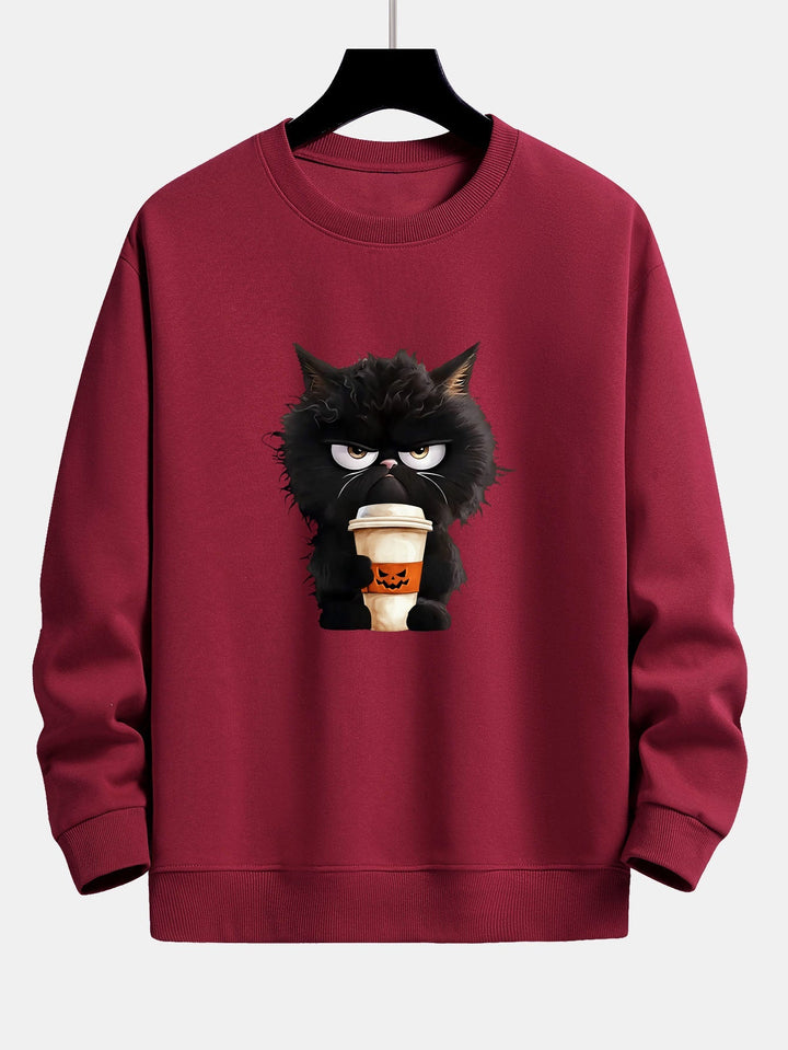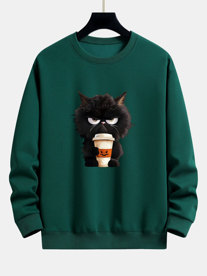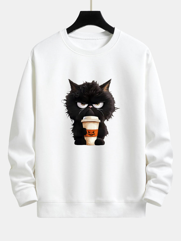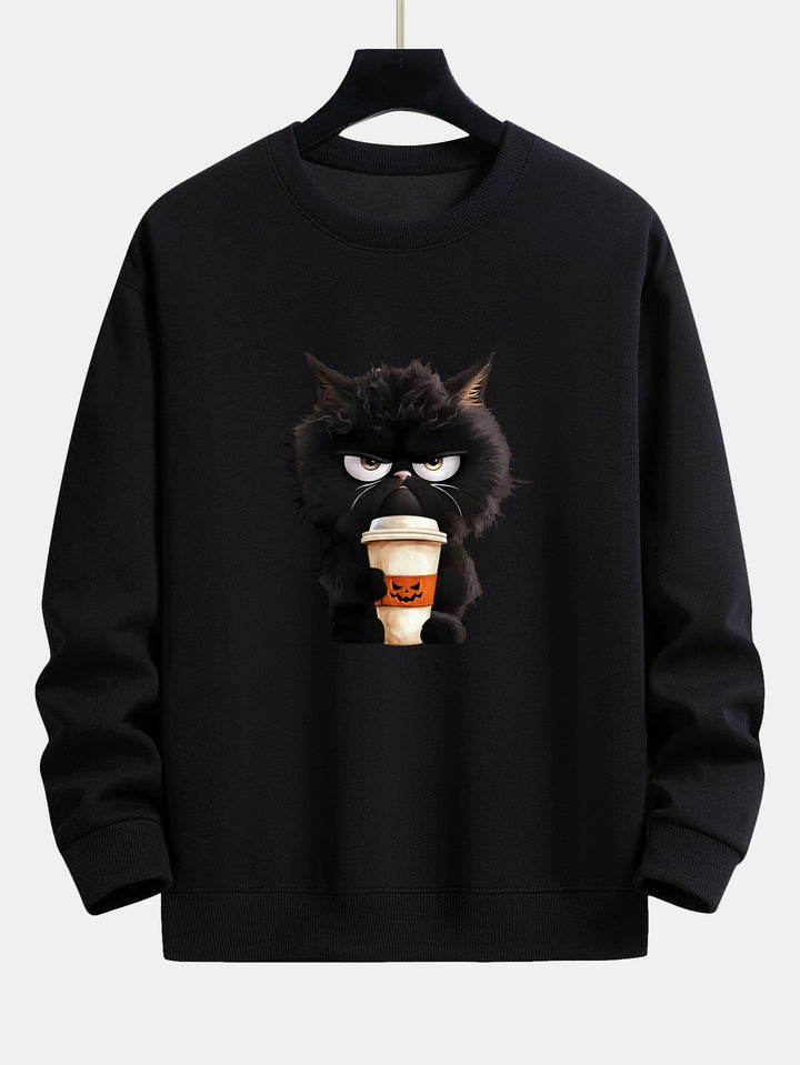 Commencez vos matinées douillettes avec style ! Notre sweatshirt arbore un adorable chat noir savourant une tasse de café, alliant l'ambiance festive d'Halloween au confort quotidien.