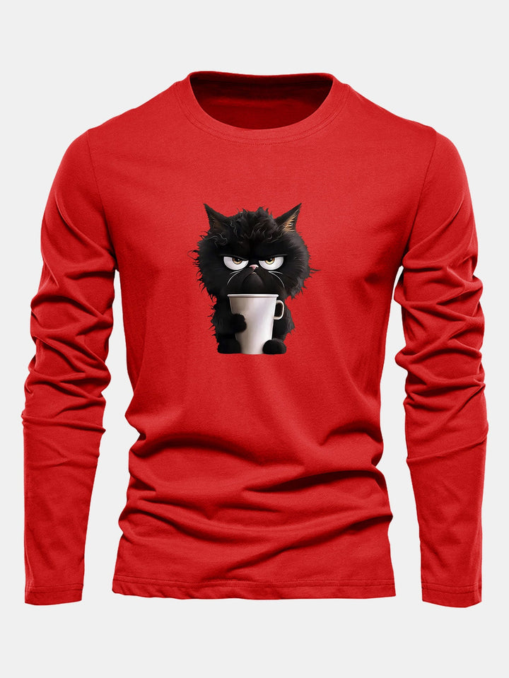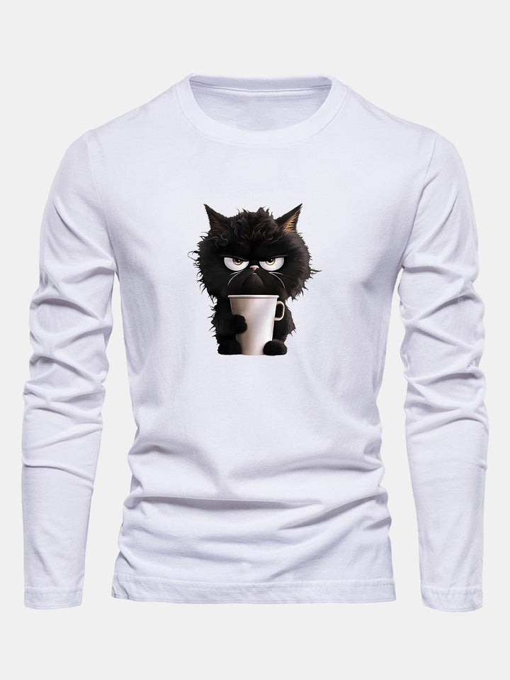 Long Sleeve Black Cat Drinking Coffee Print Cotton T-Shirt