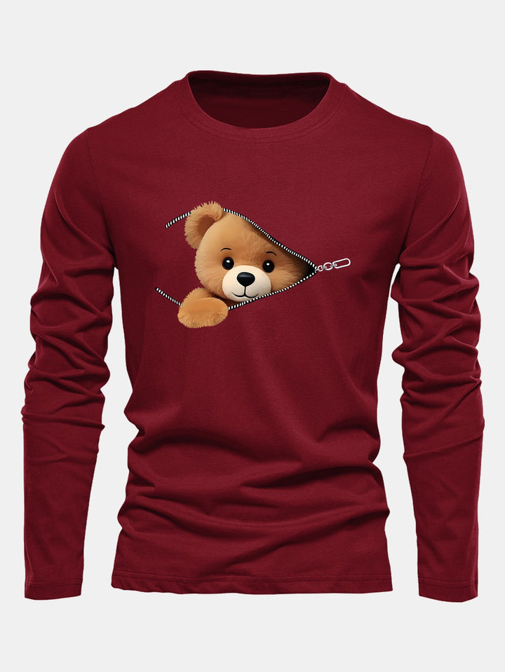Long Sleeve Zipper Bear Print Cotton T-Shirt