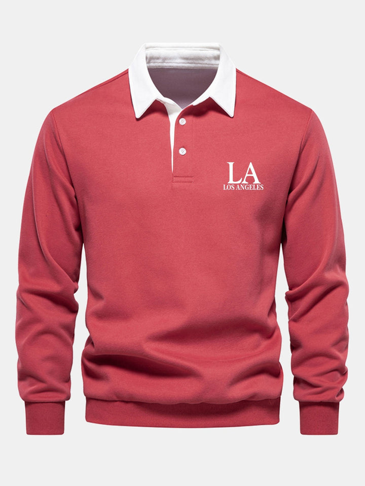 Style Unique : Avec son lettrage audacieux "Los Angeles" et son col polo contrasté, ce sweatshirt fusionne l'esprit streetwear avec des détails classiques.