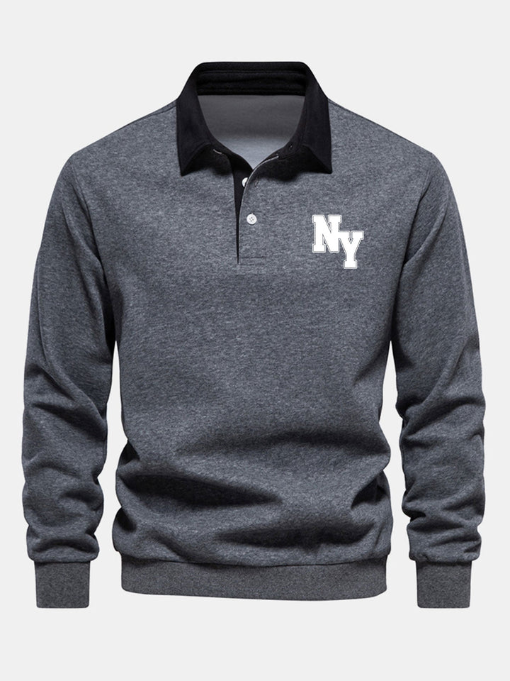 Design Urbain et Classique: Ce sweat-shirt arbore une inscription audacieuse ''New York'' sur le devant, associée à un élégant col polo contrasté, offrant une touche urbaine à un style intemporel.