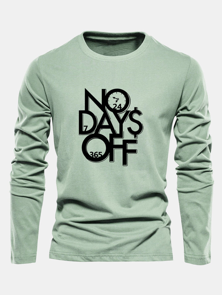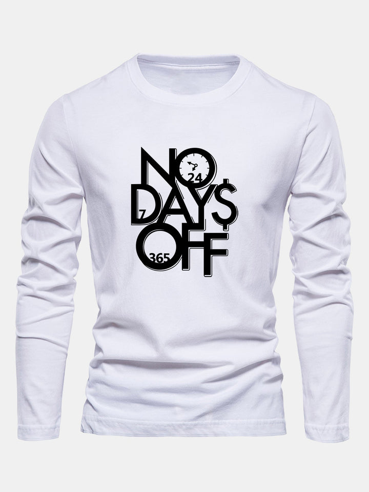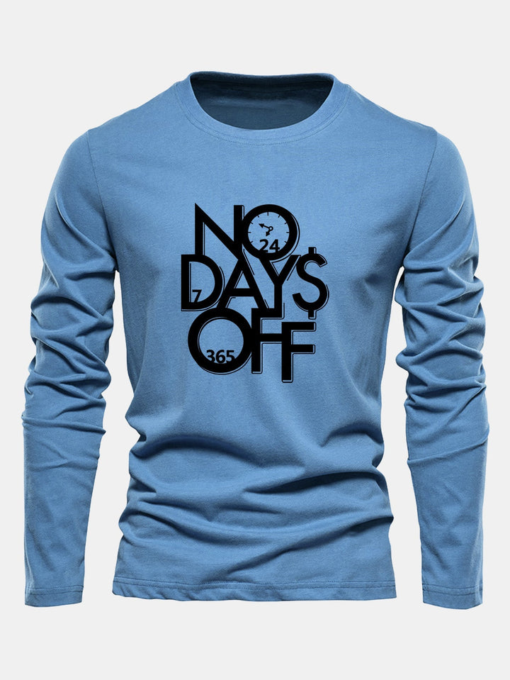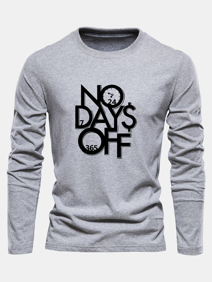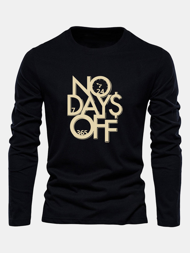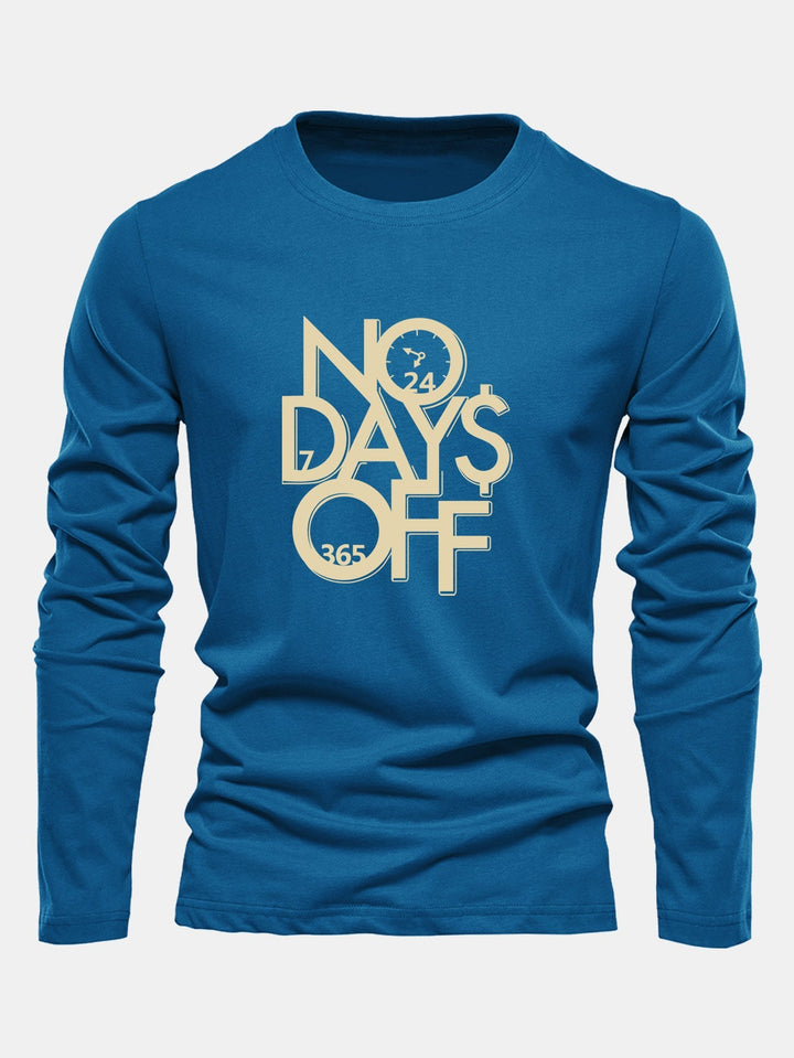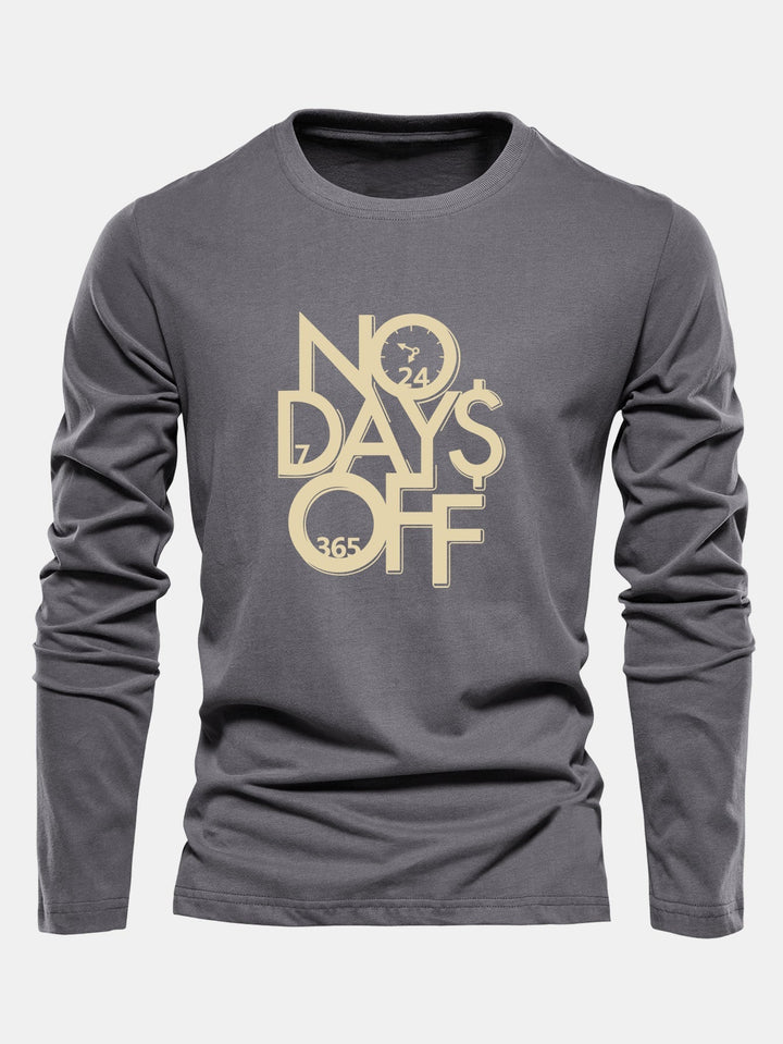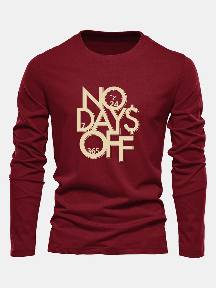 Design : Fabriqué en coton doux et respirant, ce t-shirt affiche un slogan audacieux ''No Days Off'' pour inspirer votre motivation. Sa coupe régulière et ses manches longues assurent un confort optimal et une polyvalence, idéal pour le streetwear, les entraînements ou à porter sous des vestes et des sweats à capuche.