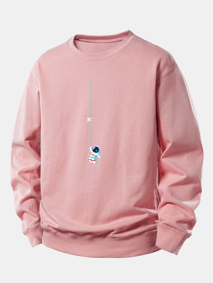 Take your style out of this world with the astronaut on a rope print relax fit sweatshirt. Featuring a fun astronaut graphic and a laid-back silhouette, this sweatshirt blends creativity with everyday streetwear comfort.