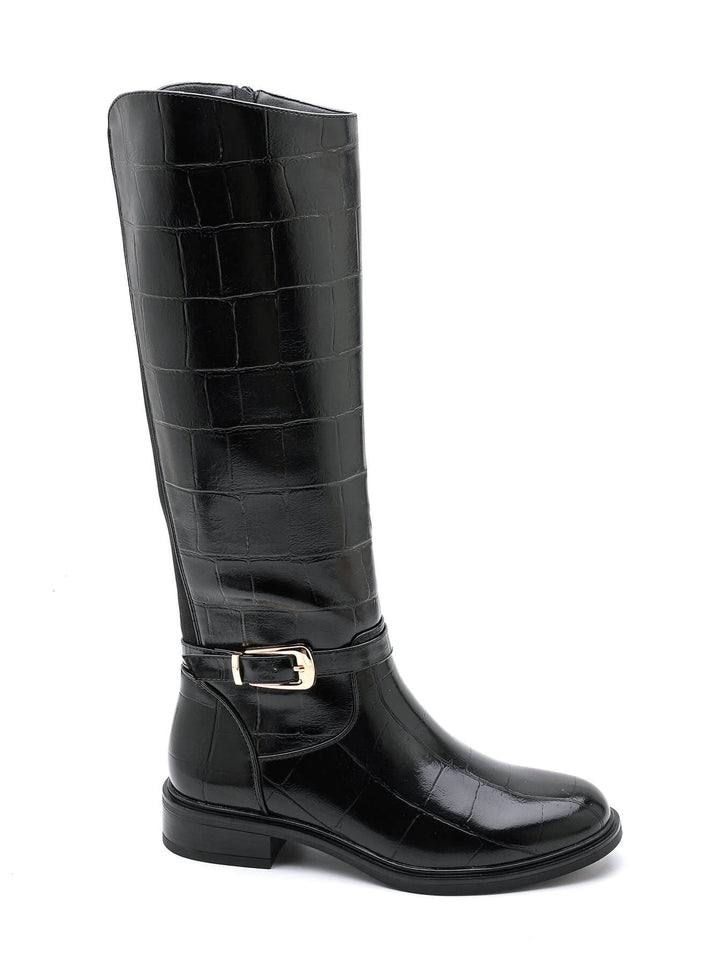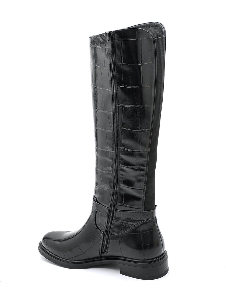 Les Bottes Cro Haute Élastiques sont un ajout élégant et intemporel à votre garde-robe. Fabriquées dans un style crocodile avec un éclat subtil, et finies avec une boucle dorée pour une allure raffinée. L'arrière est équipé d'une bande élastique, ce qui rend ces bottes parfaites pour les femmes ayant des mollets plus larges. Le confort et le style se rencontrent ici à merveille.