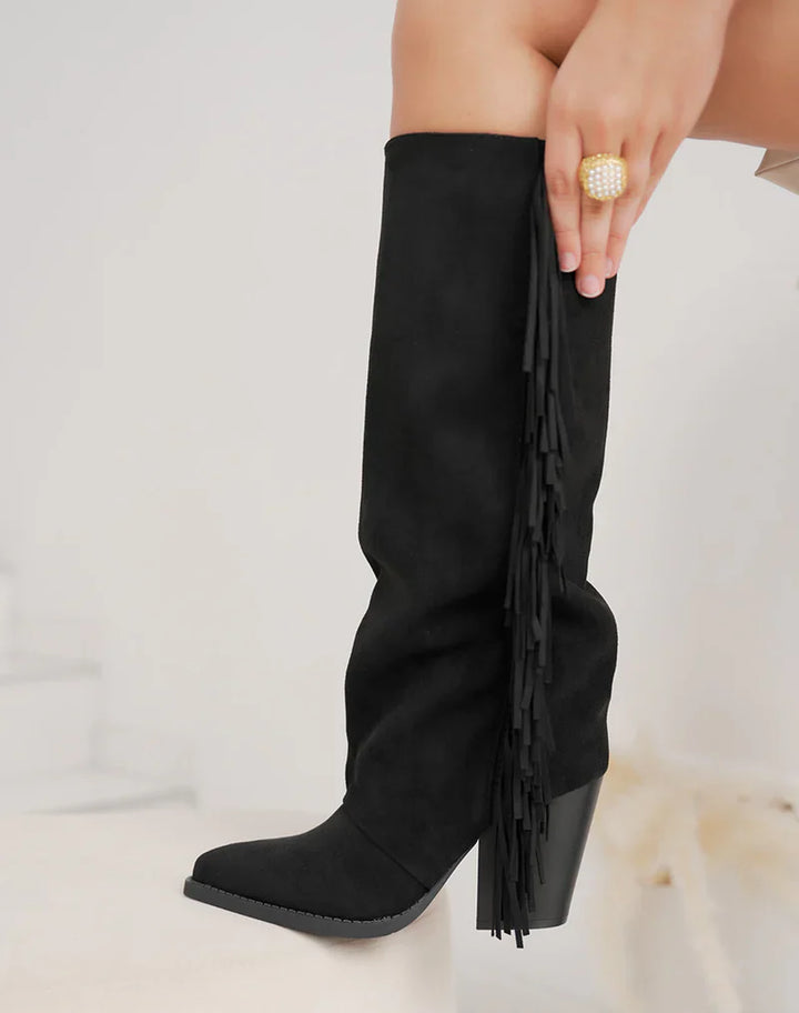 Pour une touche western élégante, optez pour les Bottes en Suédine. Ces bottes accrocheuses sont fabriquées en suédine douce et ornées de franges ludiques le long de la tige. Le solide talon bloc offre à la fois de la longueur et du confort.