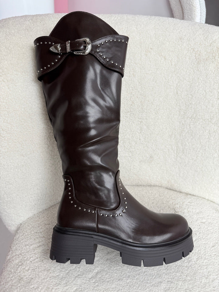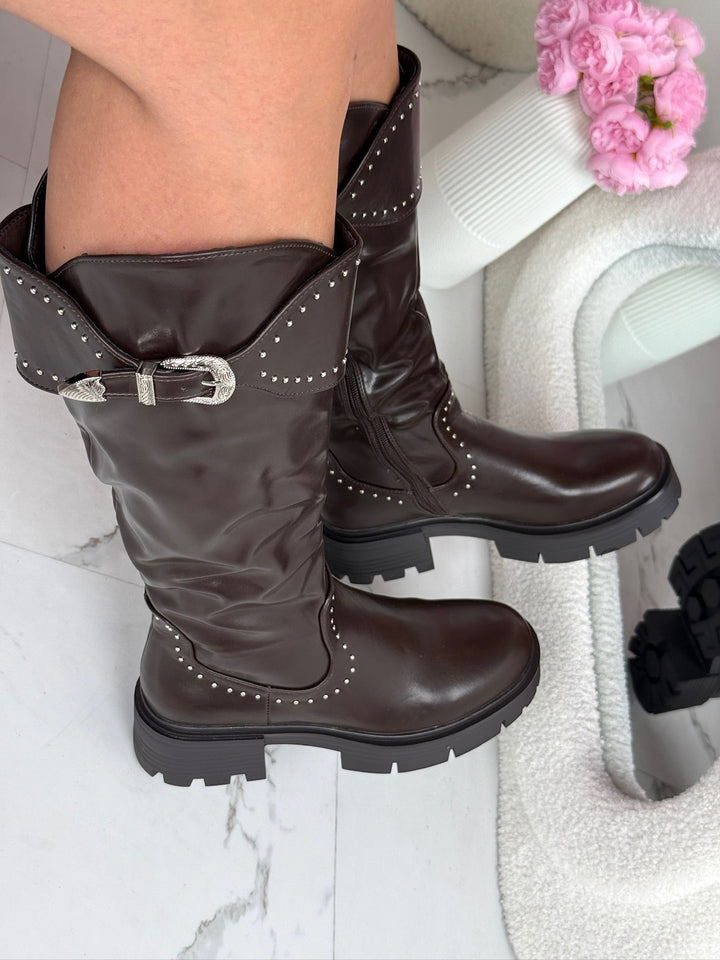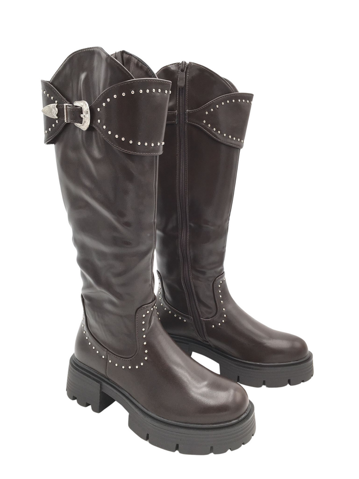 Donnez une touche edgy à votre look d'automne et d'hiver avec les Bottes Hautes à Clous. Ces bottes allient l'esprit western à une allure urbaine grâce à la boucle argentée frappante et aux clous subtils. La tige haute avec fermeture éclair assure un ajustement confortable, tandis que la semelle épaisse donne du caractère à votre tenue.
