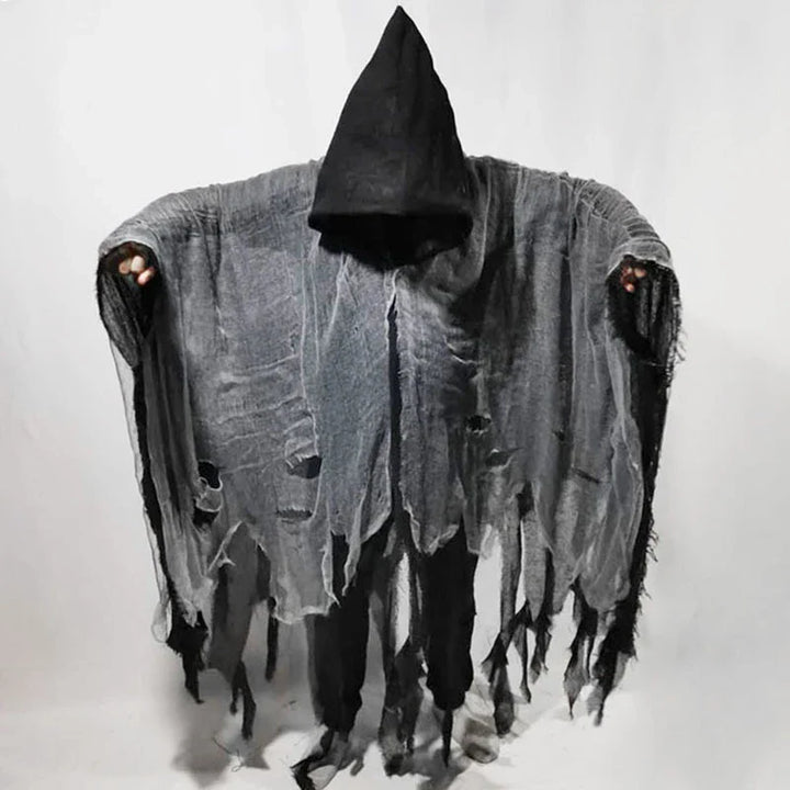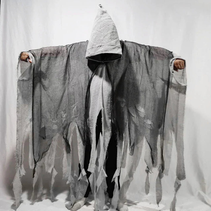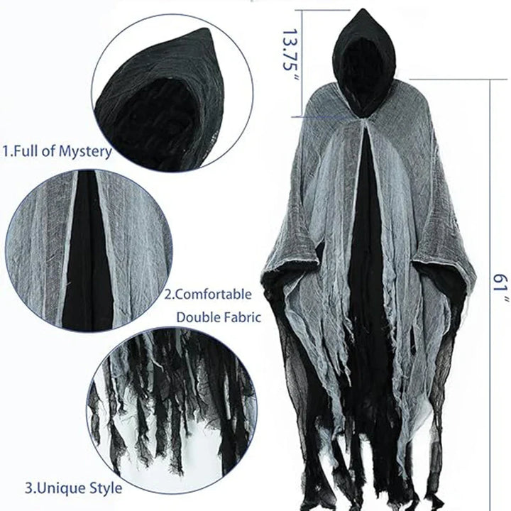 Dale un aire de misterio y oscuridad a tu look con esta capa gótica de Halloween con capucha. Su diseño largo con telas desgarradas y efecto envejecido crea un estilo aterrador perfecto para fiestas de disfraces, cosplay o el Día de los Muertos. Cómoda y ligera, se adapta fácilmente a cualquier vestuario para lograr un impacto inmediato.