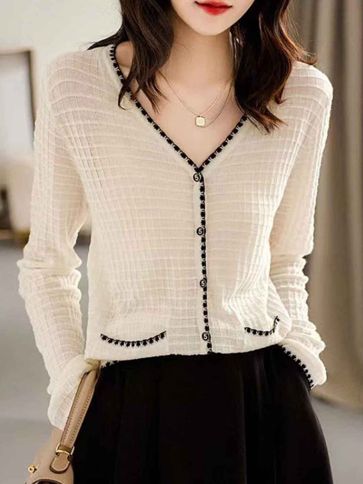 Cardigan en Tricot à Col V Classique Mariah avec Couleur Contrastée