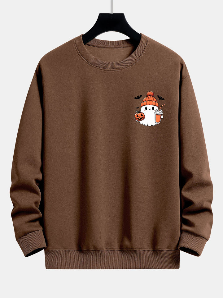 Siéntete cómodo y festivo con nuestra linda sudadera de ajuste relajado con estampado de calabaza fantasma de Halloween. Presenta un adorable fantasma con un gorro sosteniendo un latte de especias de calabaza junto a una calabaza sonriente de jack-o'-lantern, esta sudadera es la mezcla perfecta de espeluznante y dulce.