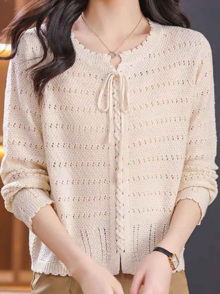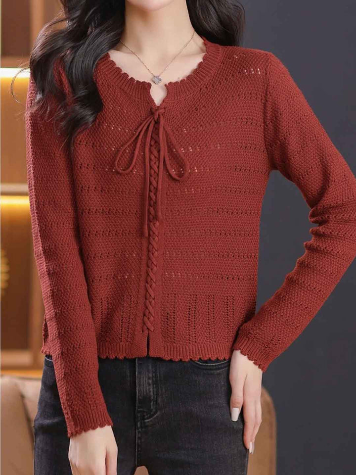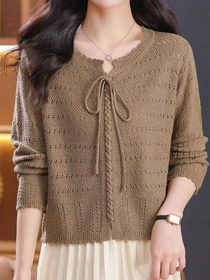Haut Tricoté à Col Rond Lâche avec Nœud de Couleur Unie