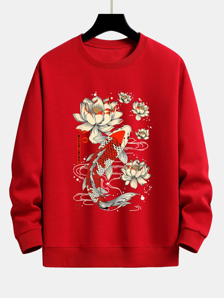 Featuring a striking Japanese-inspired koi fish design surrounded by blooming lotus flowers, this sweatshirt blends artistic beauty with everyday comfort. The relaxed fit and soft cotton-blend fabric make it perfect for casual wear, lounging, or as a standout statement piece.