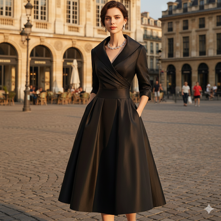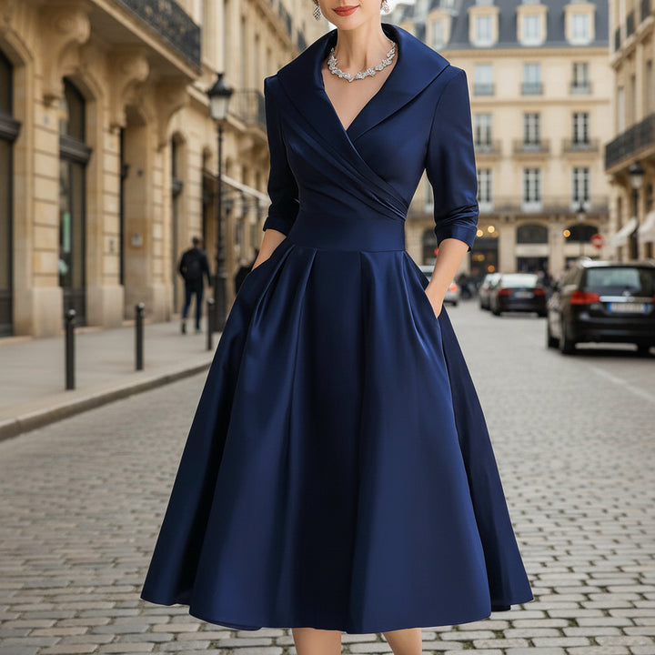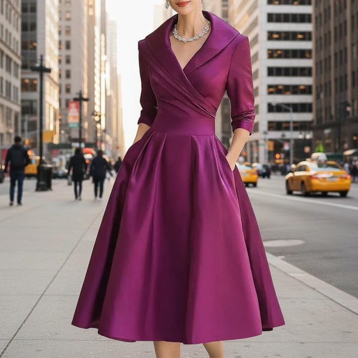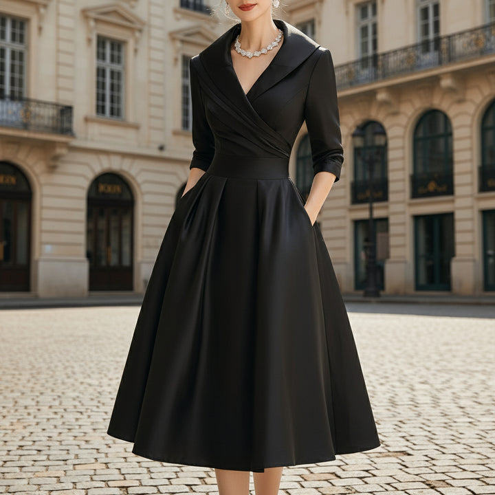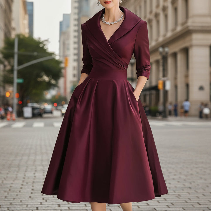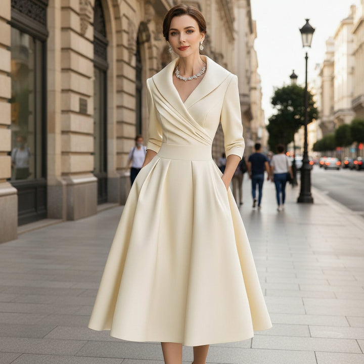 Cette robe présente un décolleté en V féminin avec un corsage doucement drapé et une longueur midi élégante. La taille structurée met en valeur votre silhouette, tandis que la jupe évasée ajoute du mouvement et du charme. Conçue avec des manches 3/4 et des poches latérales discrètes, elle offre une silhouette intemporelle qui convient aussi bien aux occasions décontractées qu'habillées.