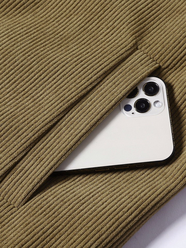 Envuélvete en estilo y comodidad sin esfuerzo con nuestra chaqueta de pana con bolsillo: una versión moderna de un clásico vintage. Confeccionada con pana suave y texturizada, esta capa versátil añade calidez y encanto retro a cualquier conjunto.