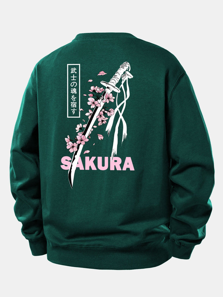 Featuring a striking design of a katana surrounded by delicate sakura blossoms, this sweatshirt combines Japanese-inspired artistry with everyday comfort. Its relaxed fit makes it perfect for layering or wearing solo, ideal for casual outings, streetwear looks, or cozy days at home.