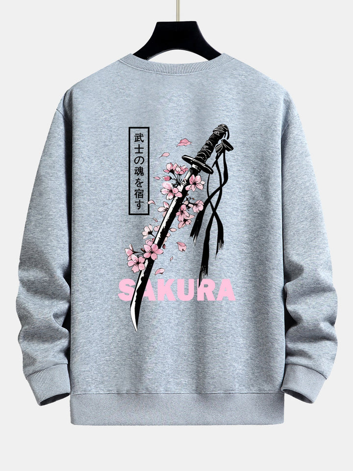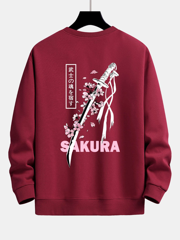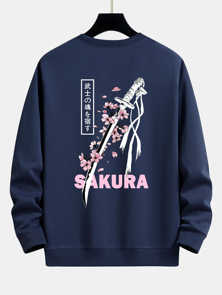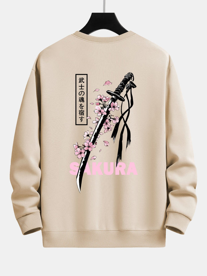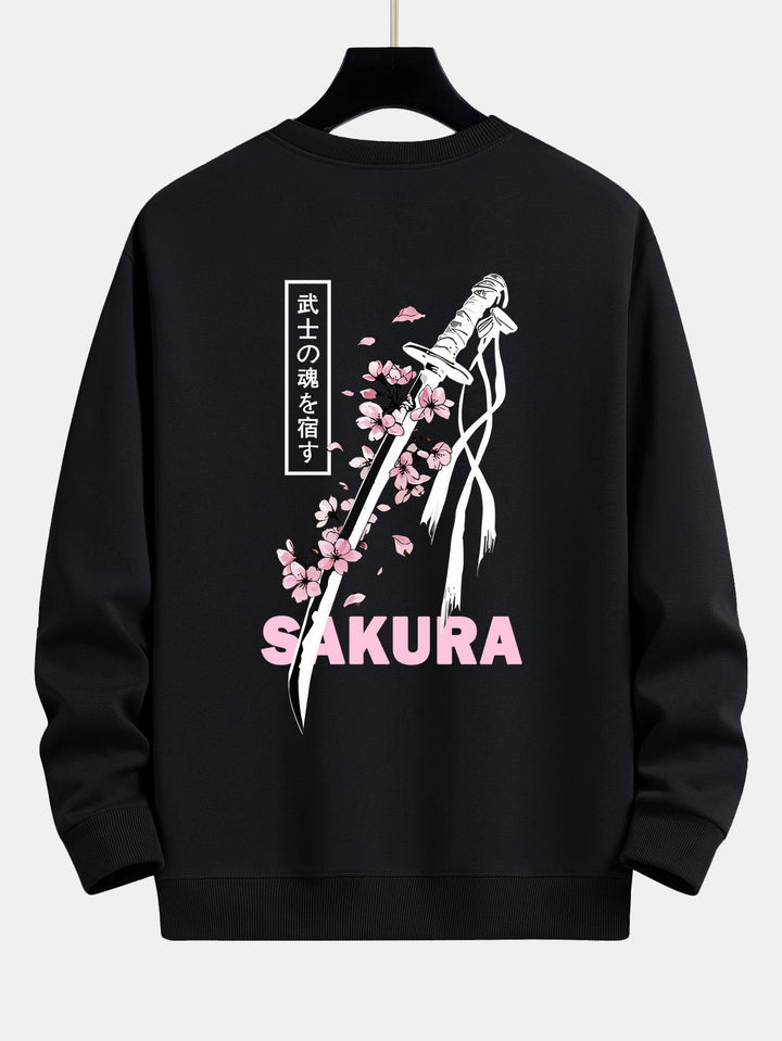 Featuring a striking design of a katana surrounded by delicate sakura blossoms, this sweatshirt combines Japanese-inspired artistry with everyday comfort. Its relaxed fit makes it perfect for layering or wearing solo, ideal for casual outings, streetwear looks, or cozy days at home.